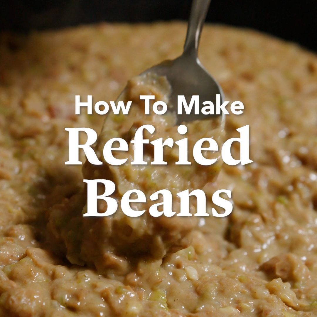 Here’s the half-scratch non-vegetarian version of refried beans from a can which was inspired by Rick Martinez’s father’s full scratch method. He came into the Bon Appetit test kitchen back in the day and made refried beans for us all to enjoy. They were so memorably delicious that they became my muse for all refried beans. I also employ this inspiration in my vegan version of refried beans, recreating the depth of flavor but without any animal or dairy products.