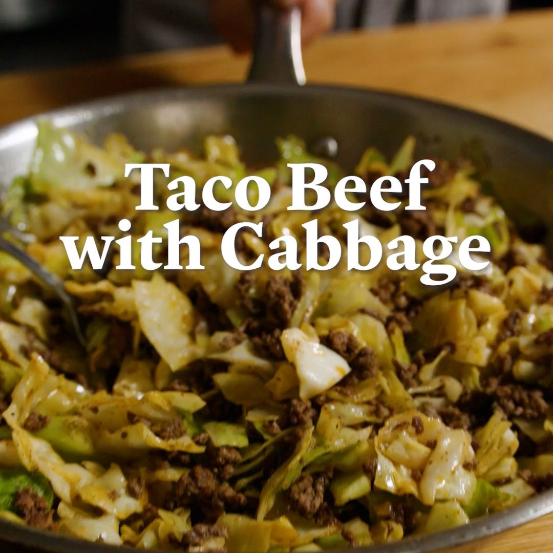 - Add 1 tablespoon of taco seasoning and stir to coat the beef. Add ¼ cup of water and cook until the beef is coated in the spice mixture and the water has mostly reduced, about 4 minutes. Add the chopped cabbage, a pinch of salt and cook until the pieces are crisp-tender, 4 minutes more. Taste and season with more salt, as needed. Serve in tacos, on top of tostadas, in a burrito or a burrito bowl.